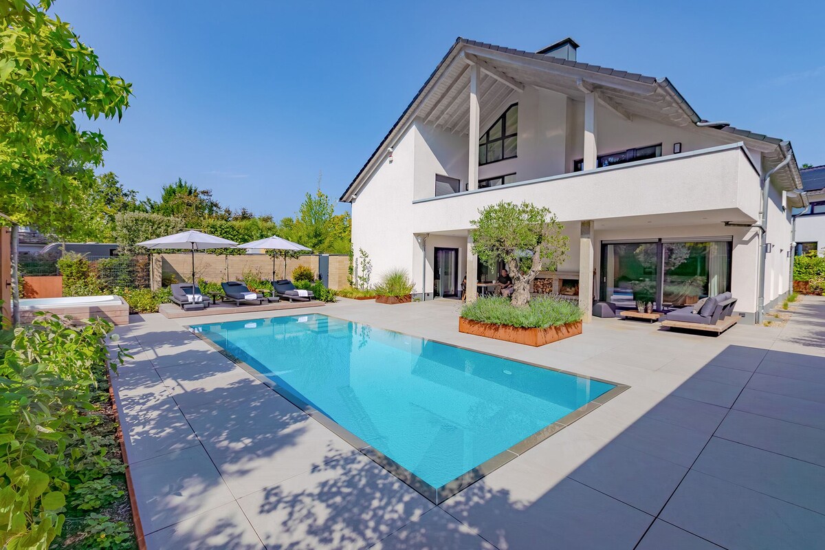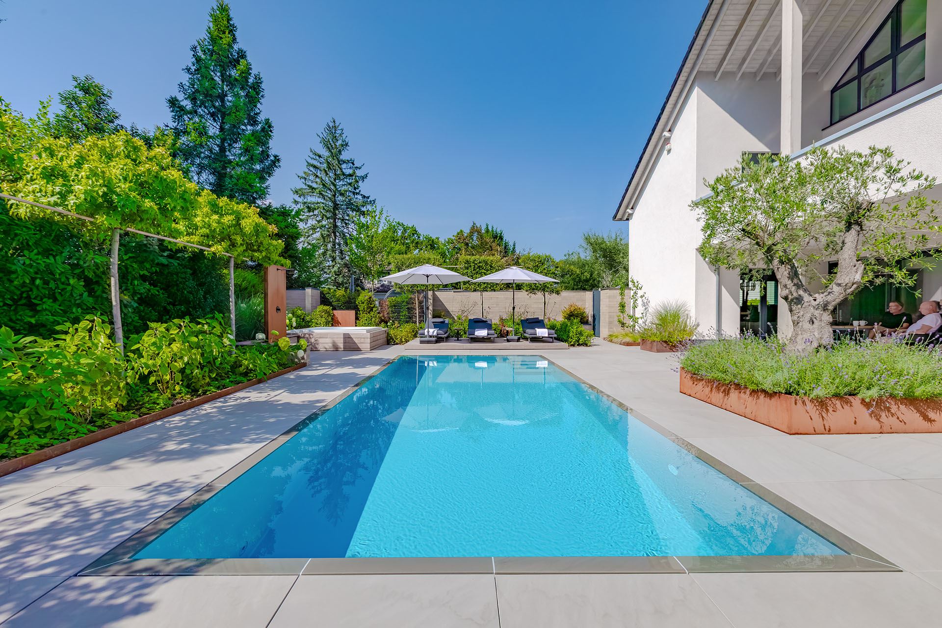 Es sind nur wenige Schritte vom Haus auf die Terrasse, und schon eröffnet sich der Blick auf einen Bereich, der in den Sommermonaten zum Mittelpunkt des Alltags wird. Das moderne, von Grün umgebene Haus und die großzügige Terrasse schaffen eine natürliche Umgebung zum Entspannen, zum Essen und für Begegnungen im Freundeskreis. Der Pool ist hier als natürlicher Bestandteil dieses Außenbereichs konzipiert – er beeinträchtigt in keiner Weise seinen Charakter, sondern rundet mit seiner ruhigen Wasserfläche die Architektur des Hauses und des Gartens ab.